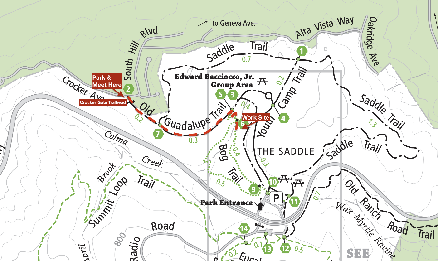 Please bring close-toed shoes, sun protection, water, and dress in layers. The meeting location is the Crocker Gate Trailhead, the entrance to the park on Crocker Avenue. There is free street parking here. Use this map or the picture below.